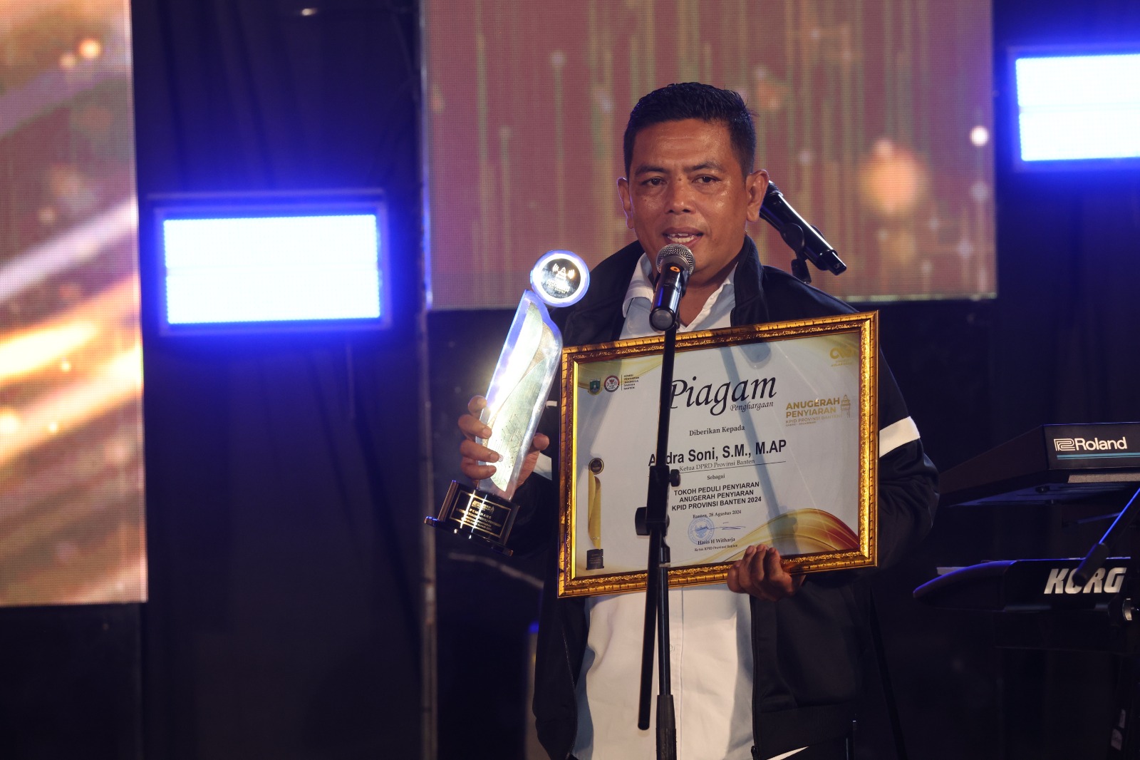 BagusNews.Co – Ketua DPRD Provinsi Banten Andra Soni meraih penganugrahaan Penyiaran 2024 Komisi Penyiaran Indonesia Daerah (KPID) Provinsi Banten sebagai Tokoh Peduli Penyiaran.