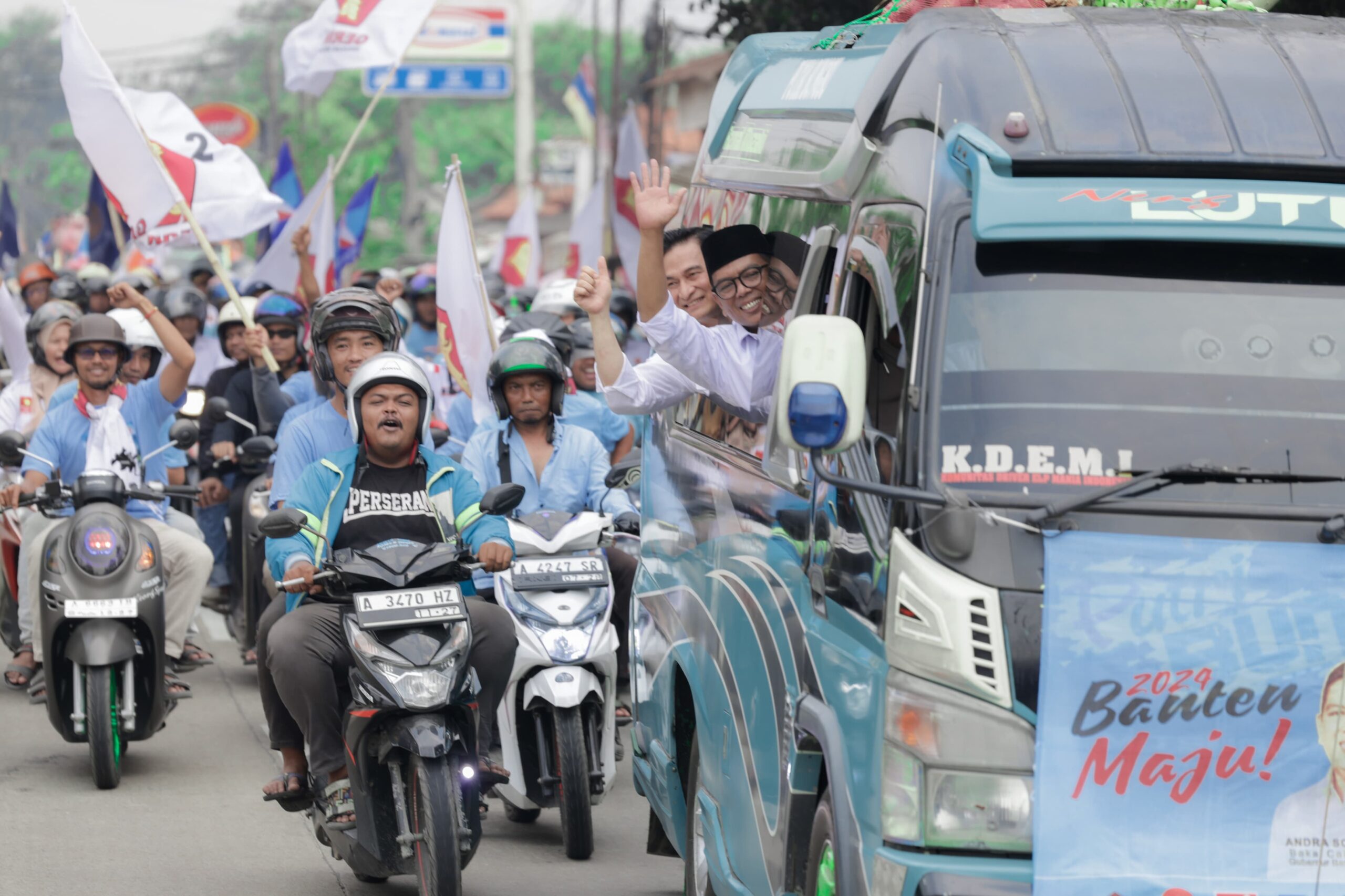 BagusNews.Co – Pasangan bakal calon Gubernur dan Wakil Gubernur Andra Soni-Dimyati Natakusuma menggunakan Mobil Elf Angkutan Umum yang biasa digunakan sebagai alat transportasi menuju wilayah Banten Selatan, pada Kamis 29 Agustus 2024.