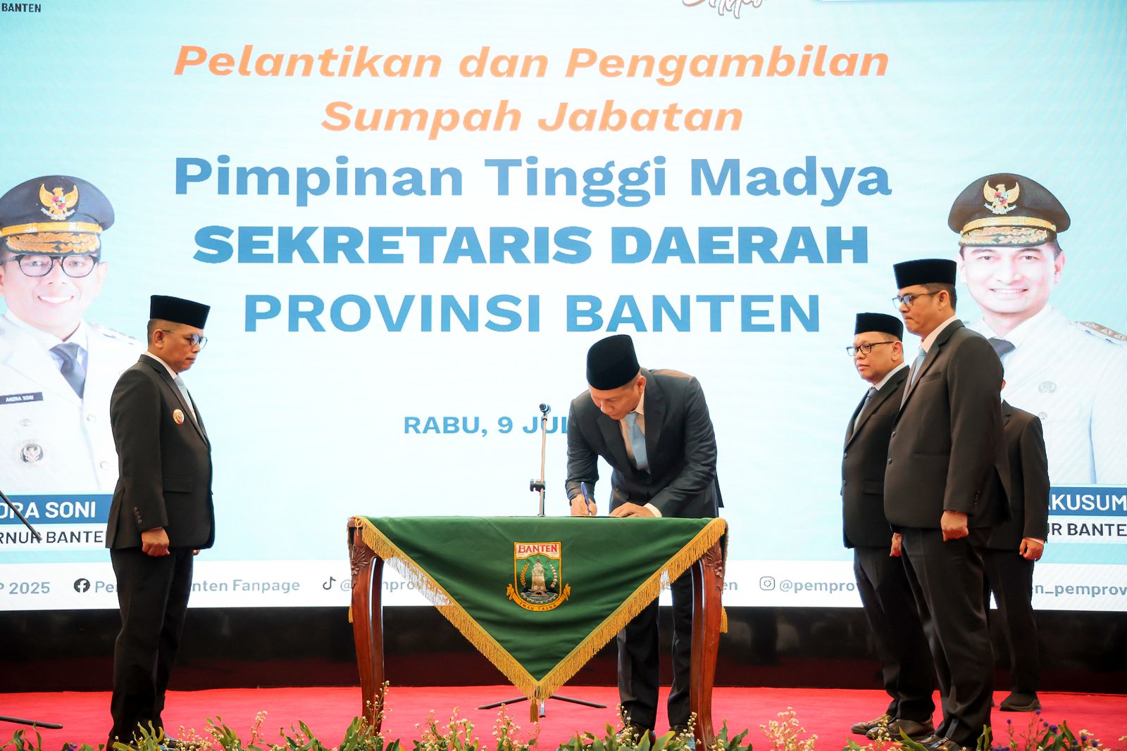 BagusNews.Co – Gubernur Banten Andra Soni melantik dan memimpin pengambilan sumpah Jabatan Pimpinan Tinggi Madya Sekretaris Daerah (Sekda) Provinsi Banten Deden Apriandhi Hartawan di Pendopo Gubernur Banten, KP3B, Kota Serang, Rabu 9 Juli 2025.