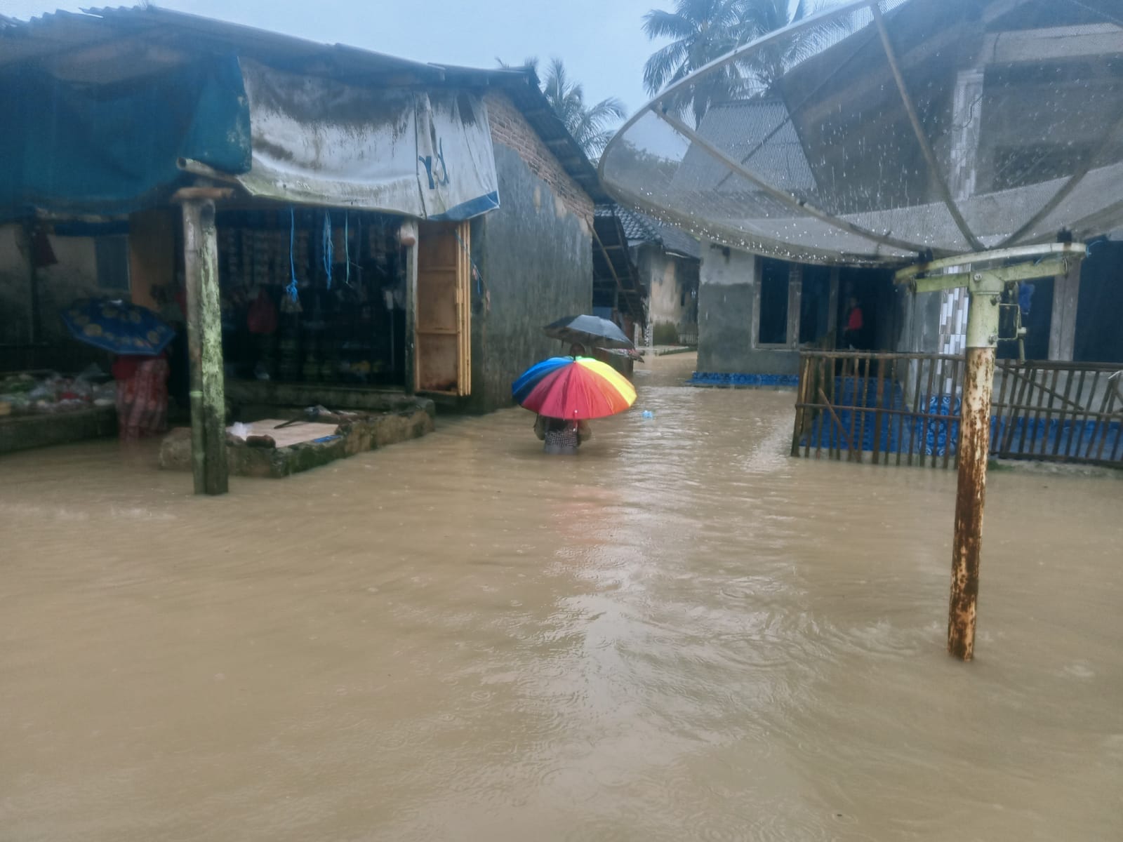 Akibatnya, air banjir mencapai setinggi lutut warga, menghambat mobilitas dan aktivitas sehari-hari mereka.